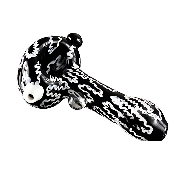 Introducing the Dark Static Pipe. This is gorgeous piece made with borosilicate glass. It is about 4.3 inches long. The design runs throughout the piece. This glass pipe has two stubs, one on the right and the second one on the left, allowing for the perfect grip.
